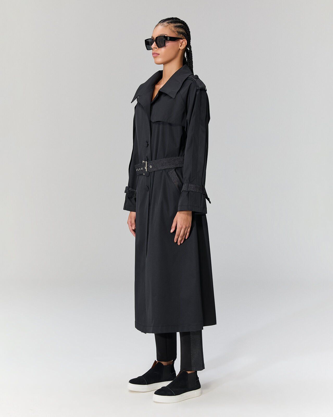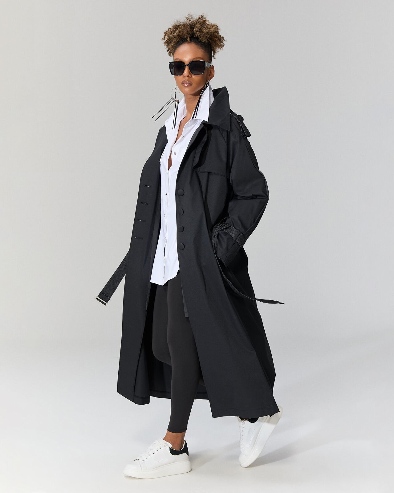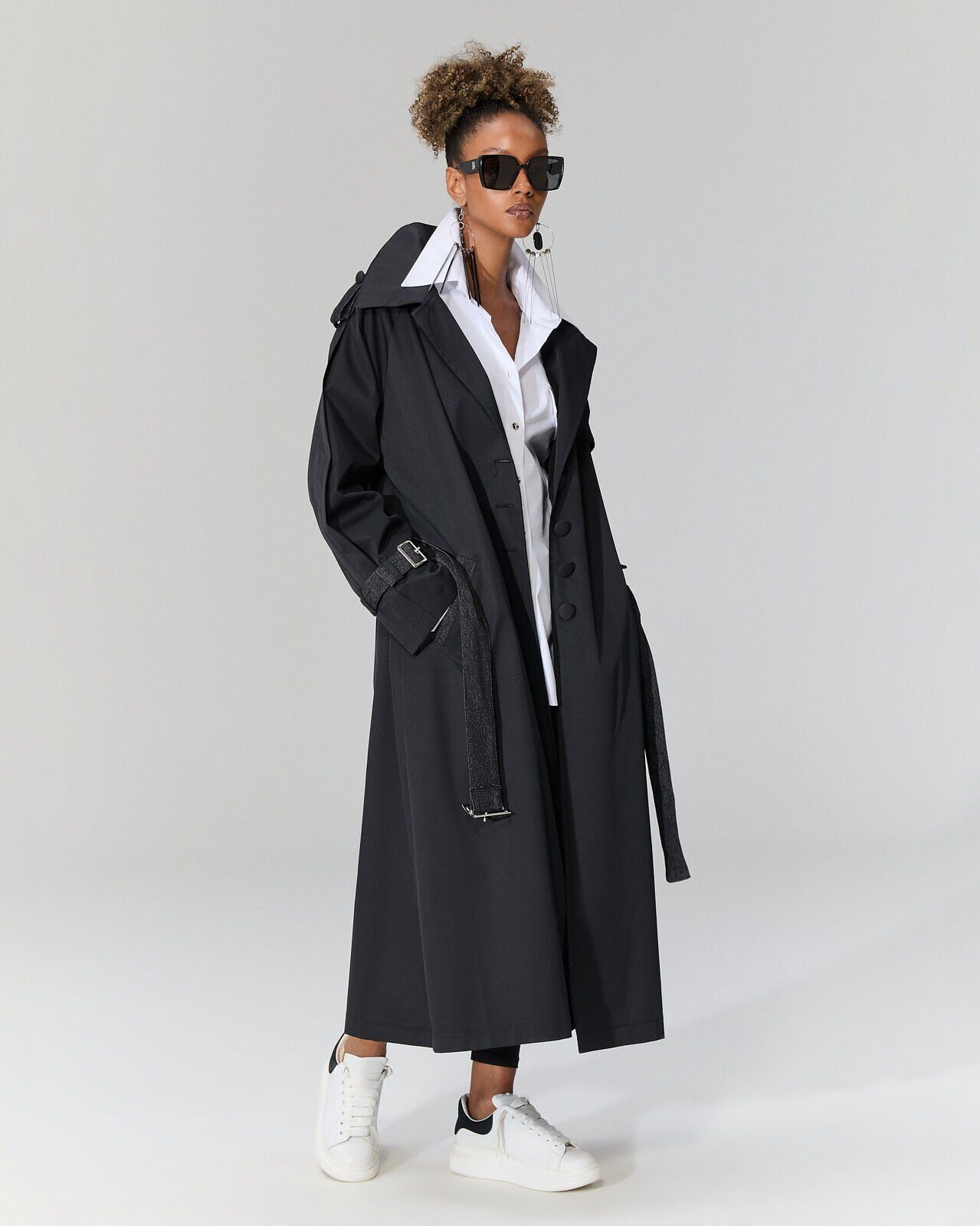 Bu şık siyah trenç, tarzınıza sofistike bir dokunuş katacak. İnce detaylar ve yüksek kaliteli malzeme ile tasarlanmış olan bu trenç, her mevsimde kullanabileceğiniz şık bir seçenek. Hem günlük kullanım hem de özel günler için ideal olan bu trenç ile her kombin mükemmel olacak.