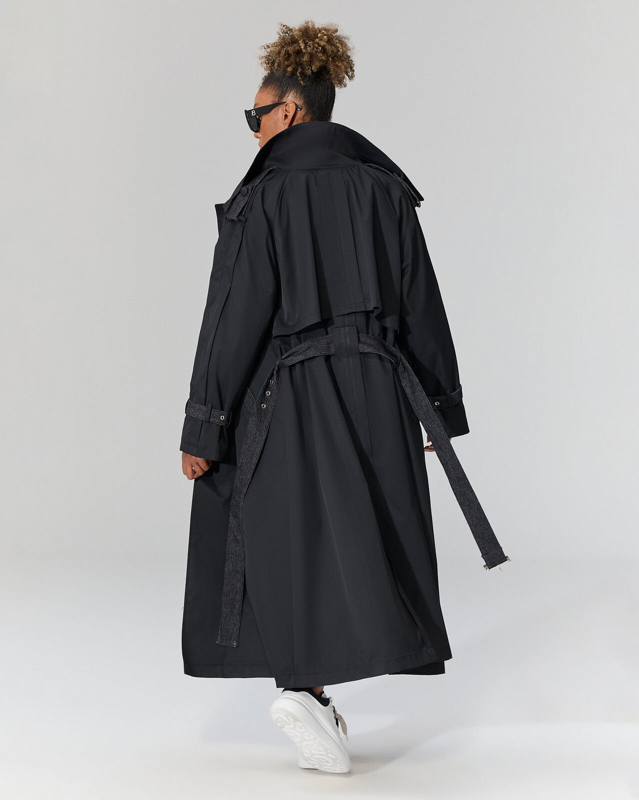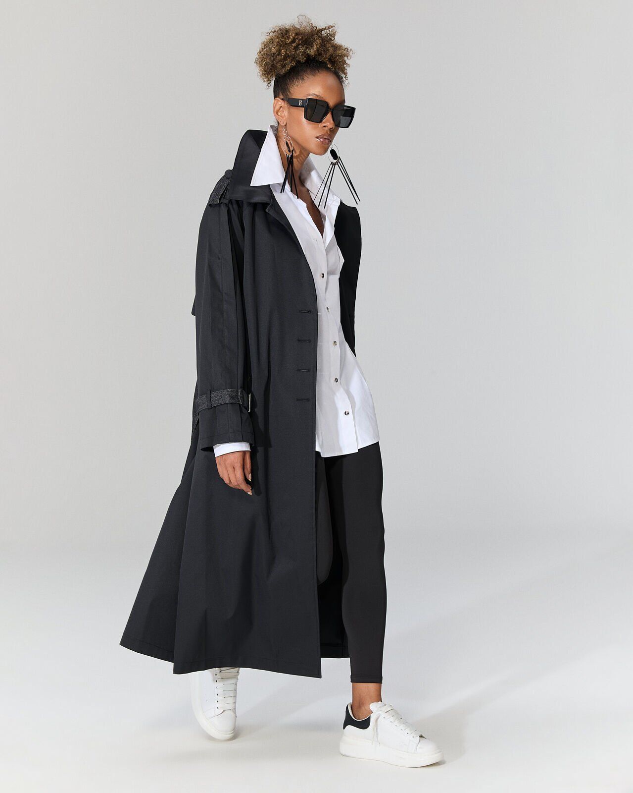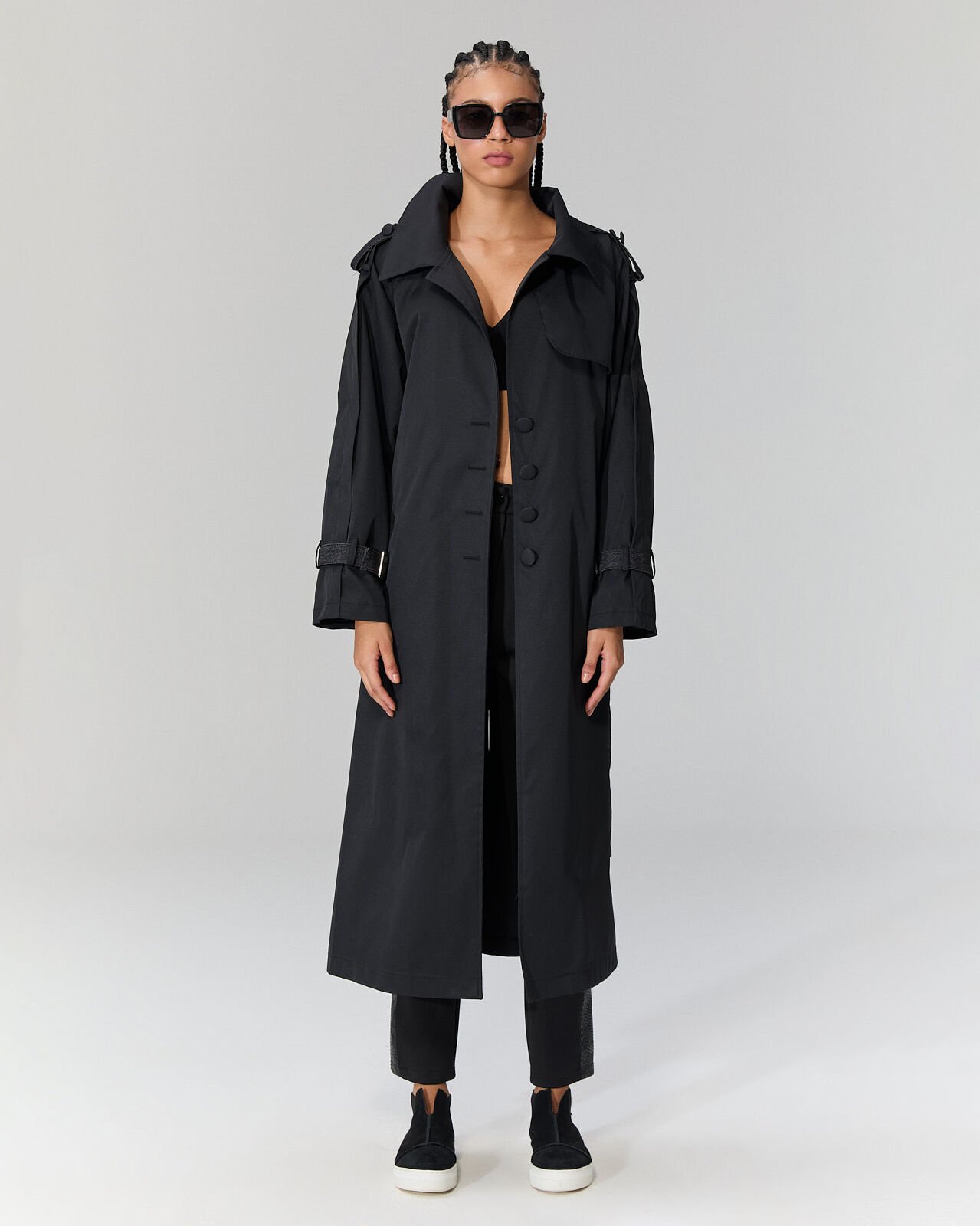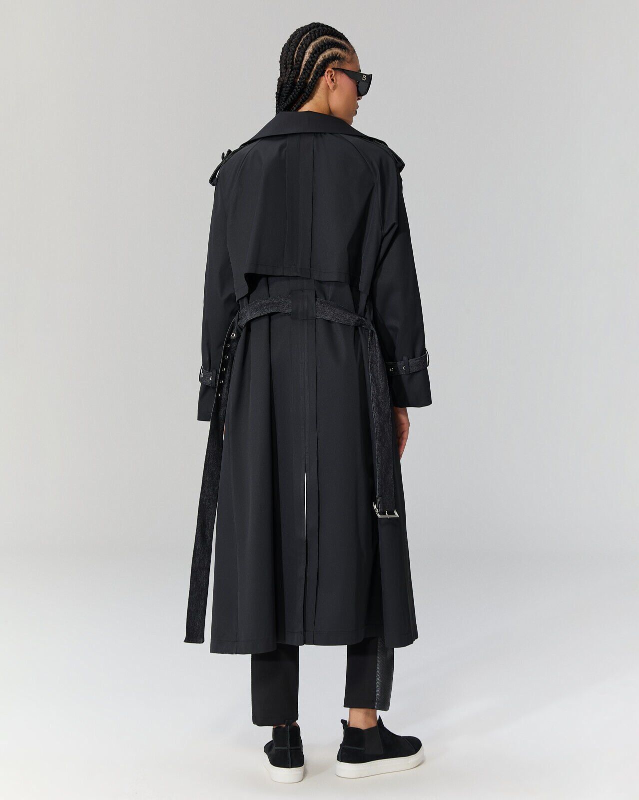 Bu şık siyah trenç, tarzınıza sofistike bir dokunuş katacak. İnce detaylar ve yüksek kaliteli malzeme ile tasarlanmış olan bu trenç, her mevsimde kullanabileceğiniz şık bir seçenek. Hem günlük kullanım hem de özel günler için ideal olan bu trenç ile her kombin mükemmel olacak.
